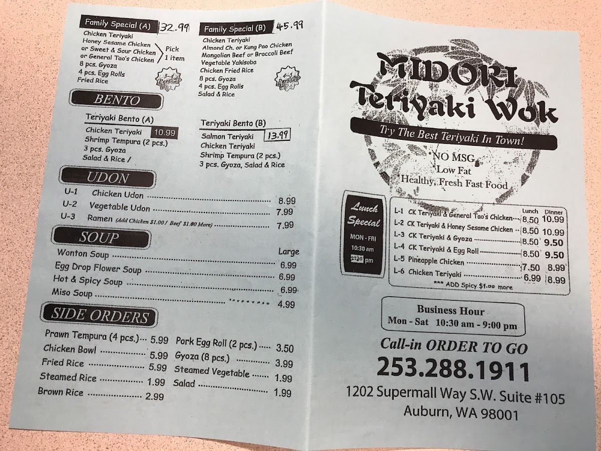 Introducing the menu at Midori Teriyaki Wok, a culinary gem located at 1202 Supermall Way #105, Auburn, WA. This restaurant offers a delightful blend of flavors, making it a favorite among locals. Customers rave about the generous portion sizes and speedy service, making it an ideal stop for lunch.